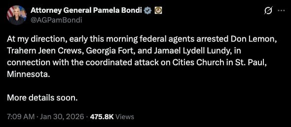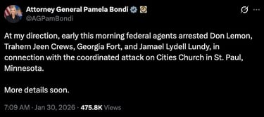 19. Four prominent Black journalists, including Don Lemon were ARRESTED after a Judge and a Federal appellate court refused to issue a warrant for their arrest. Pam Bondi, who is just as bad as Puppy Killer Noem had this to say…