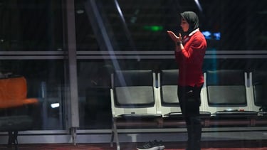 A member of Iran’s women’s soccer team prays at the Kuala Lumpur International Airport in Sepang, Malaysia, Monday, March 16, 2026. (AP Photo/Azneal Ishak)