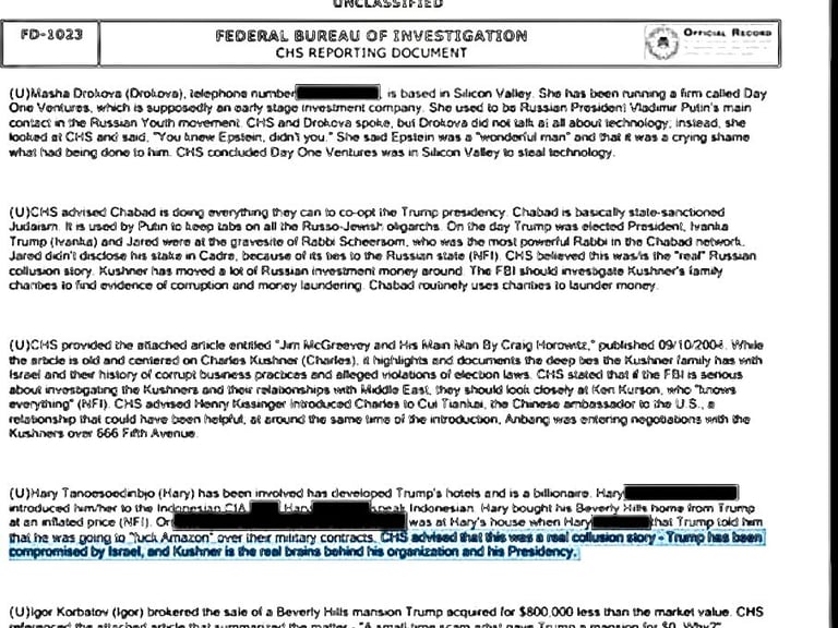 19. Well, Epstein file EFTA00090314, a raw intelligence report states that, "Trump has been compromised by Israel. And Kushner is the real brains behind his organization and his presidency."
