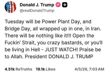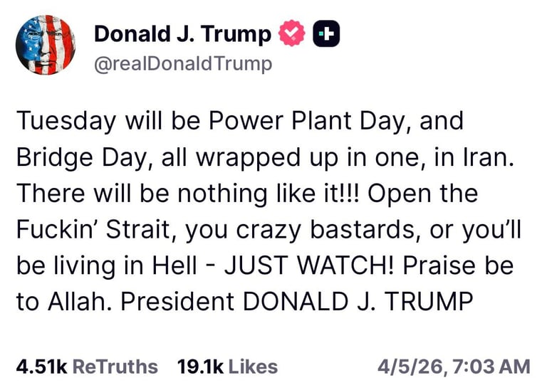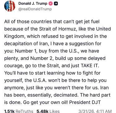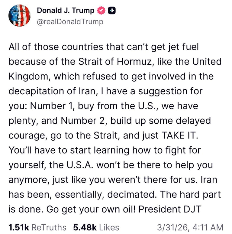 - The Strait of Hormuz needs to open, and will open naturally later - The USA didn't want regime change in Iran, and the USA has already forced regime change in Iran
