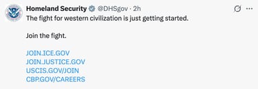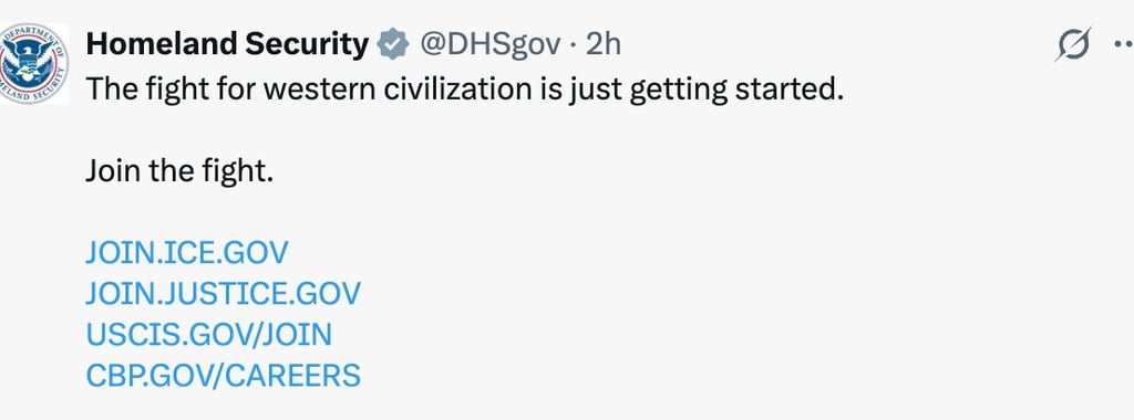 18. Why is Homeland Security posting things like this? Really, why? Could it be that Western Civilization” to the Trump Administration means “white supremacy”?