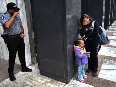 Photo by Carol Guzy of a family's devastation after their husband/father was dragged away by ICE agents, and this security guard was simultaneously moved to tears. What are we doing?