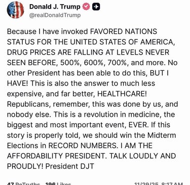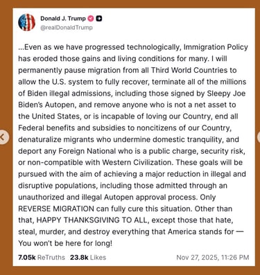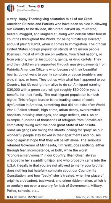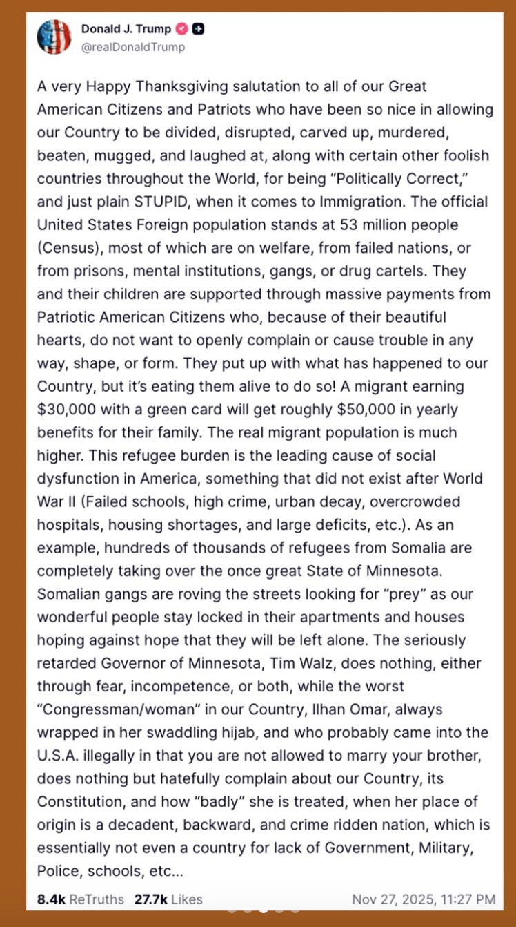 8. Well, it wouldn’t be Thanksgiving without a a barrage of hateful, unhinged, and frankly, stupid, messages from Trump. In one of his speeches, he called the governor of Illinois (Pritzger) a “big, fat, slob” (which is weird considering how fond Trump is of mirrors). He called Governor Waltz “seriously retarded” (my apologies for repeating the slur). He made an Islamophobic joke directed at “the worst ‘Congressman/woman’ in our Country, Ilhan Omar, always wrapped in her swaddling hijab”. Well, you can read the whole “inspirational message of unity and thankfulness” for yourself…