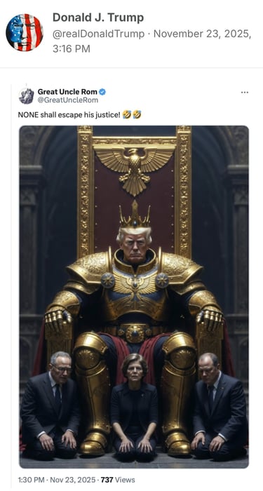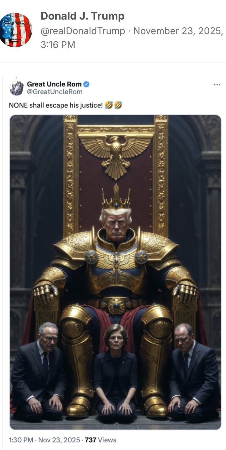 6. In this week’s edition of Why is JD Vance Such an Asshole?, Vance posted this (and Trump of course reposted it). They continue to double-down on stating straight out that they want a king instead of a president – a dictatorship instead of a democracy.